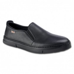 Zapato unisex con cierre de elásticos laterales. Corte de microfibra, forrado con microfibra técnica, acolchado en el tobillo para evitar rozaduras. Horma recta de puntera redondeada. Contrafuerte de dureza suficiente para sujetar el calcáneo. Plantilla acolchada de microfibra técnica sobre espuma de poliuretano termoconformado con tratamiento antibacterias y carbón activado. Suela de EVA con resaltes para evitar el deslizamiento.